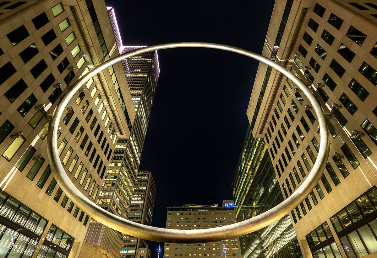 L’Anneau est une installation sur mesure et un témoignage unique de l’importance symbolique de la Place Ville Marie (PVM), lieu de naissance de la modernité architecturale de Montréal. L’élégante oeuvre aérienne circulaire de 30 mètres de diamètre en acier inoxydable, flottant entre les tours 2/3 et 4 de PVM, est une installation spécifique au site qui incarne monumentalité et humilité. Encadrant la vue emblématique le long de l’avenue McGill College, vers les portes de l’Université McGill, le mont Royal et sa croix caractéristique, l’Anneau renforce la composition architecturale et le caractère intemporel de la Place Ville Marie.
