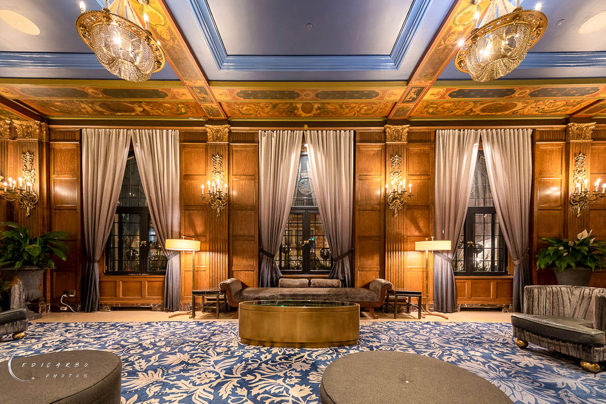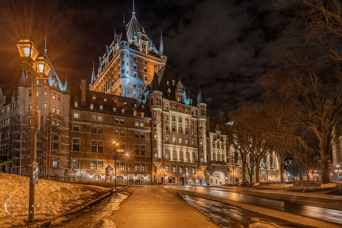 Photographie architecturale la nuit de l'hôtel Le Château Frontenac qui a reçu prix distinction par Int.Design International avec logo